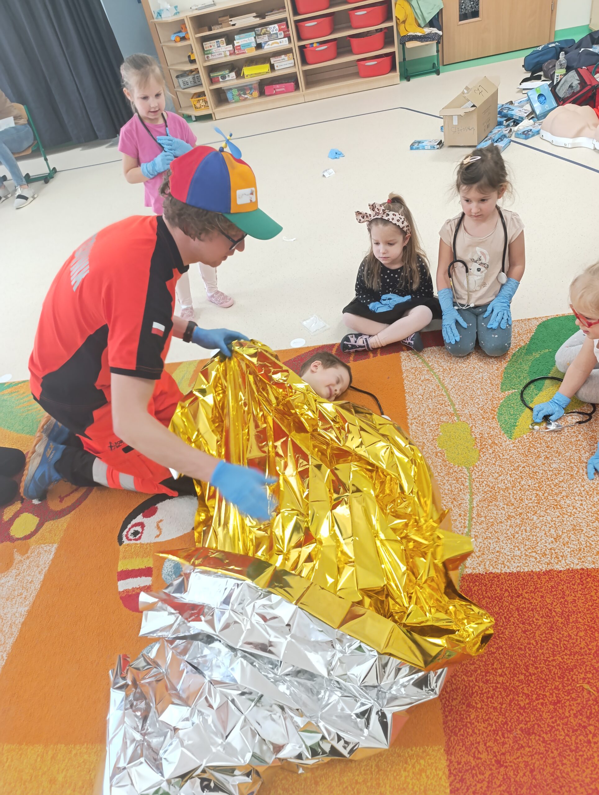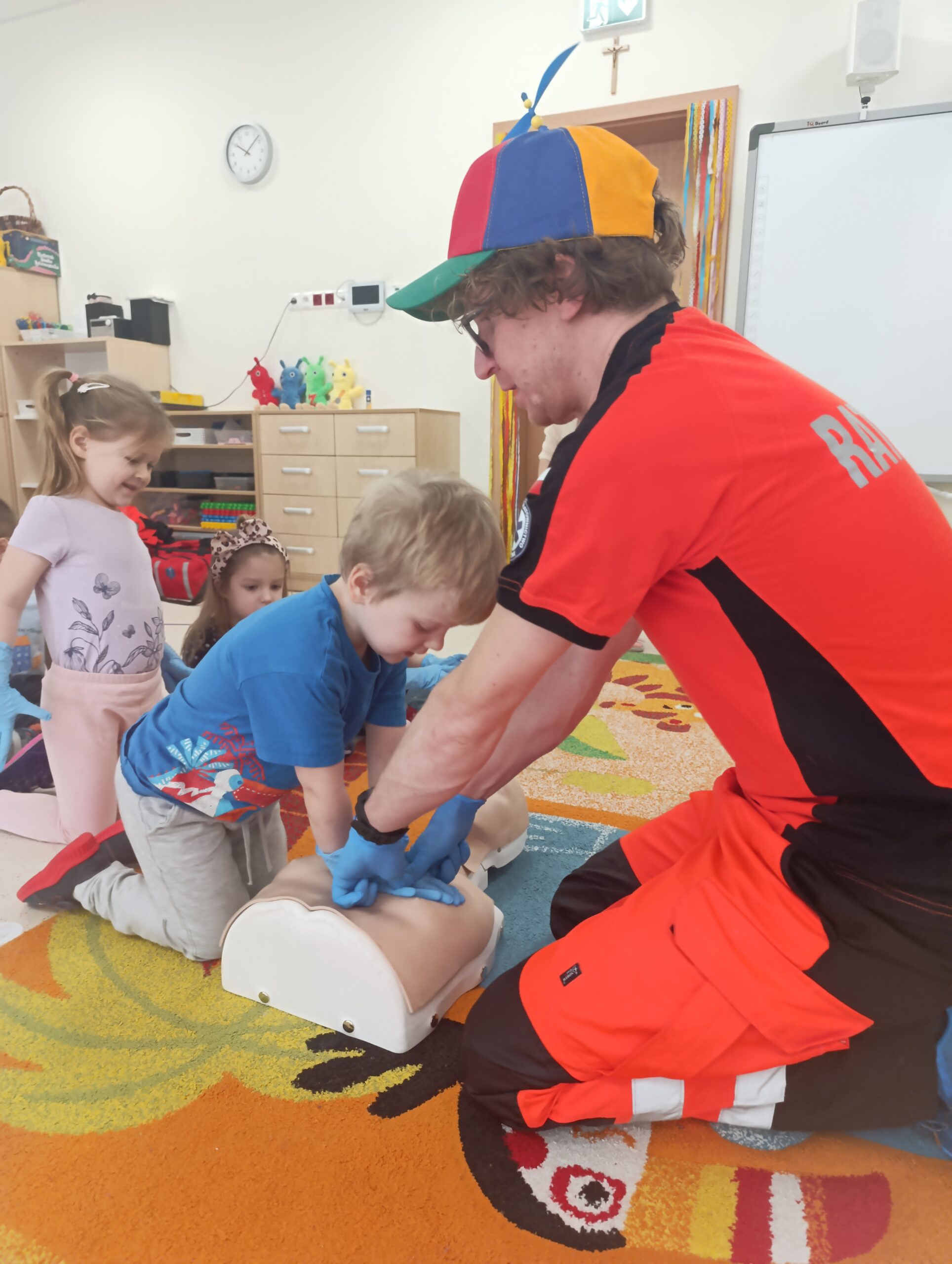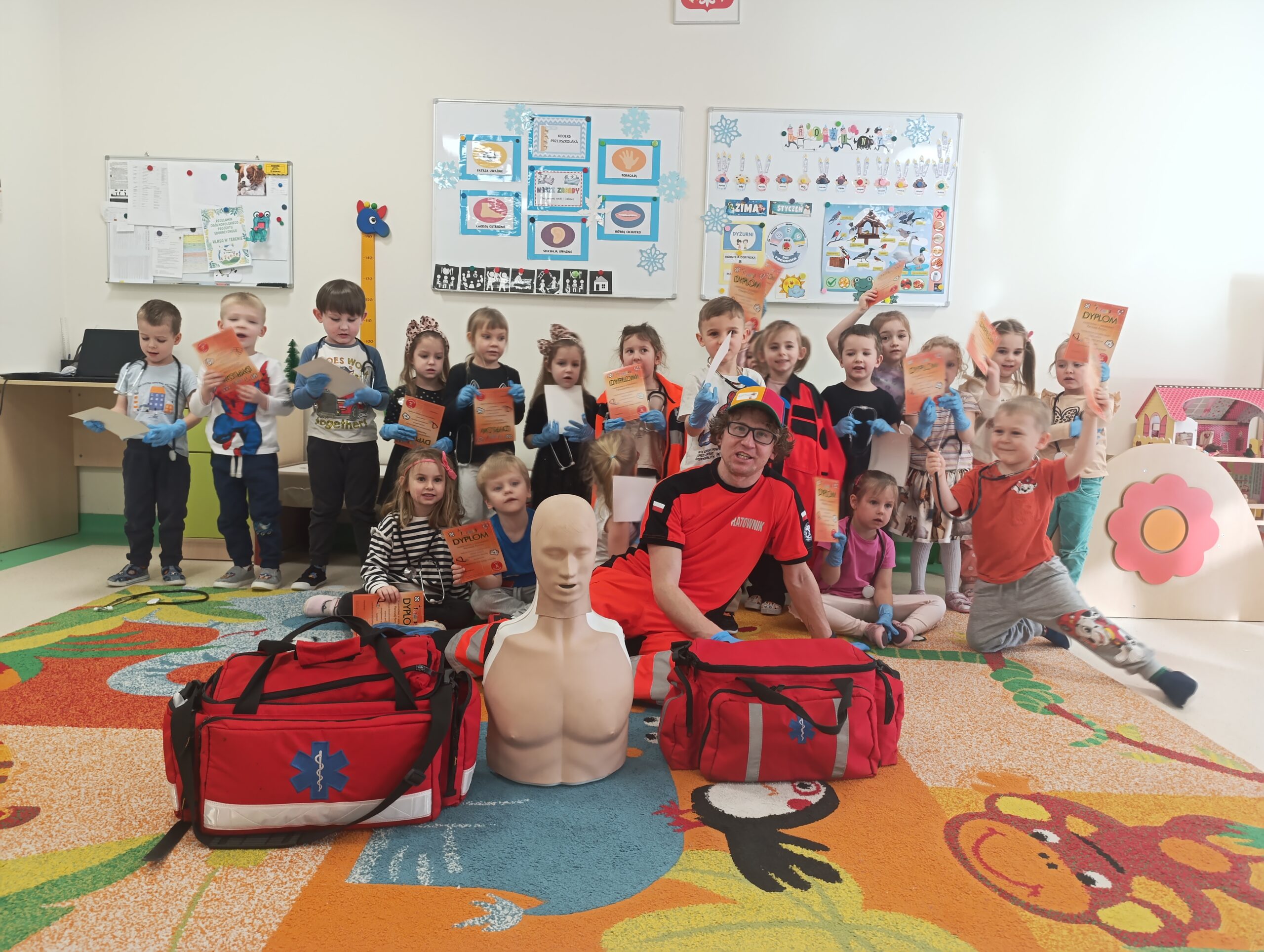 Spotkanie miało na celu kształtowanie pozytywnych i bezpiecznych postaw oraz zapoznanie dzieci z podstawowymi czynnościami ratowniczymi w przypadku nieobecności osób dorosłych. Była to doskonała lekcja – połączenie zabawy z przekazywaniem jakże istotnej wiedzy, która może przynieść nieoceniony efekt – ratowanie życia.