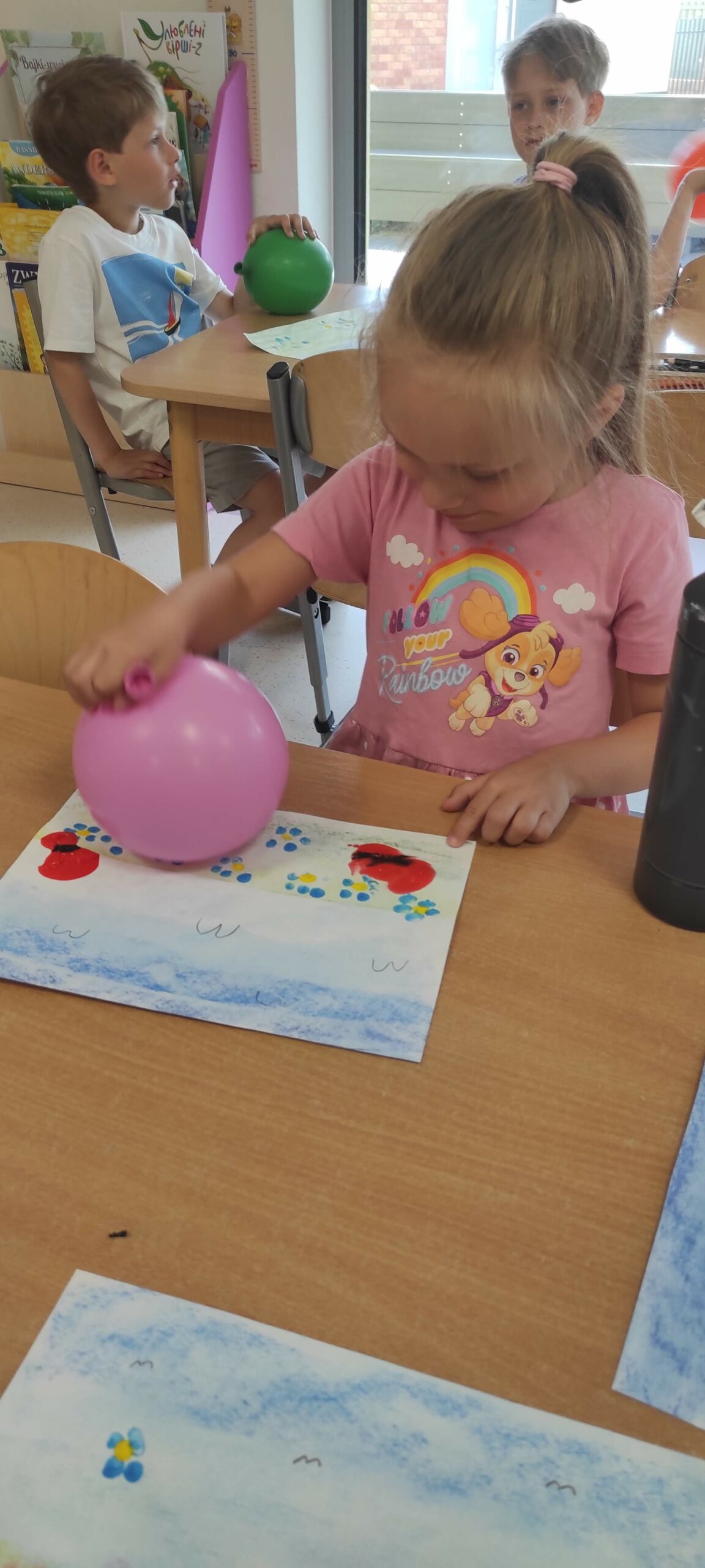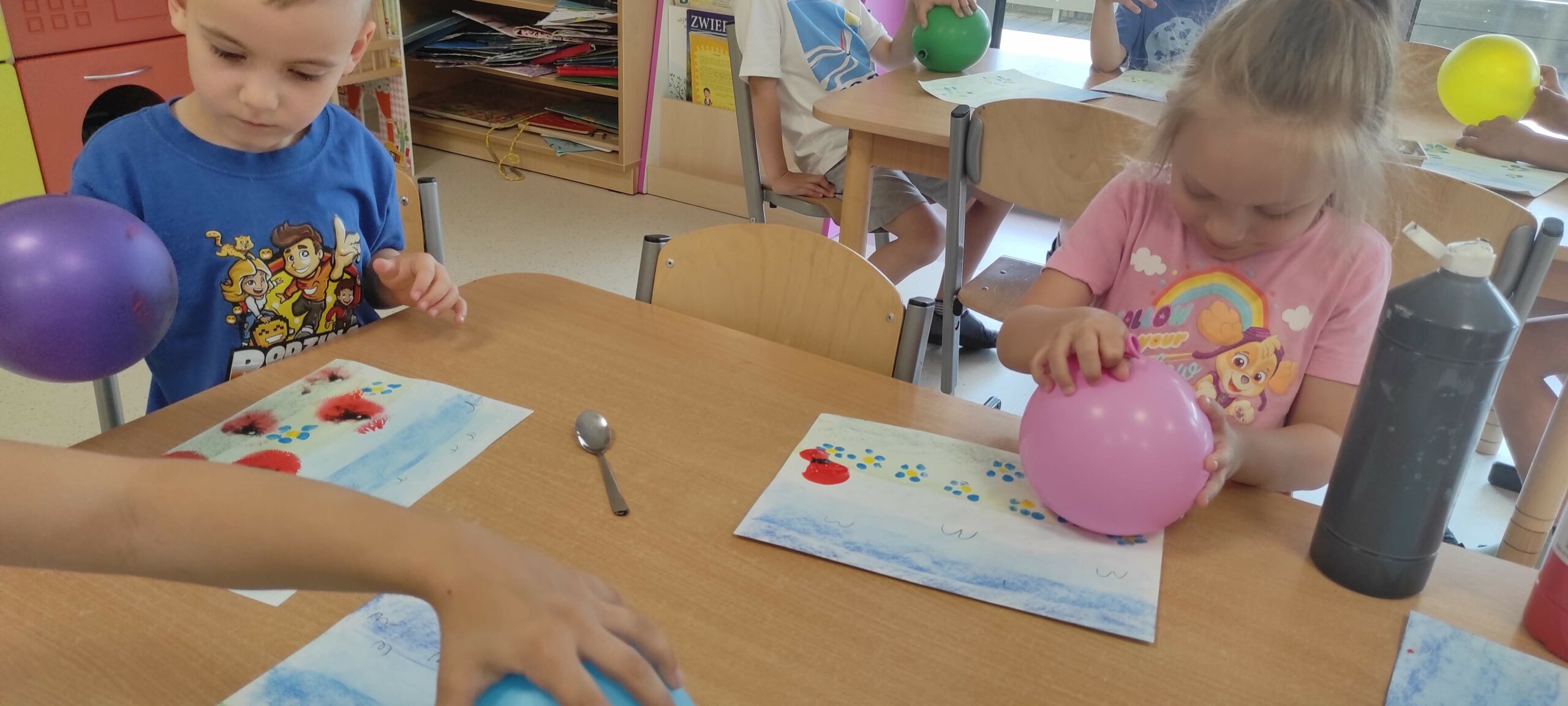 W dalszej części zajęć balony wykorzystaliśmy do zabaw plastycznych, bowiem przy ich pomocy tworzyliśmy obrazy pt. „Majowa łąka”.