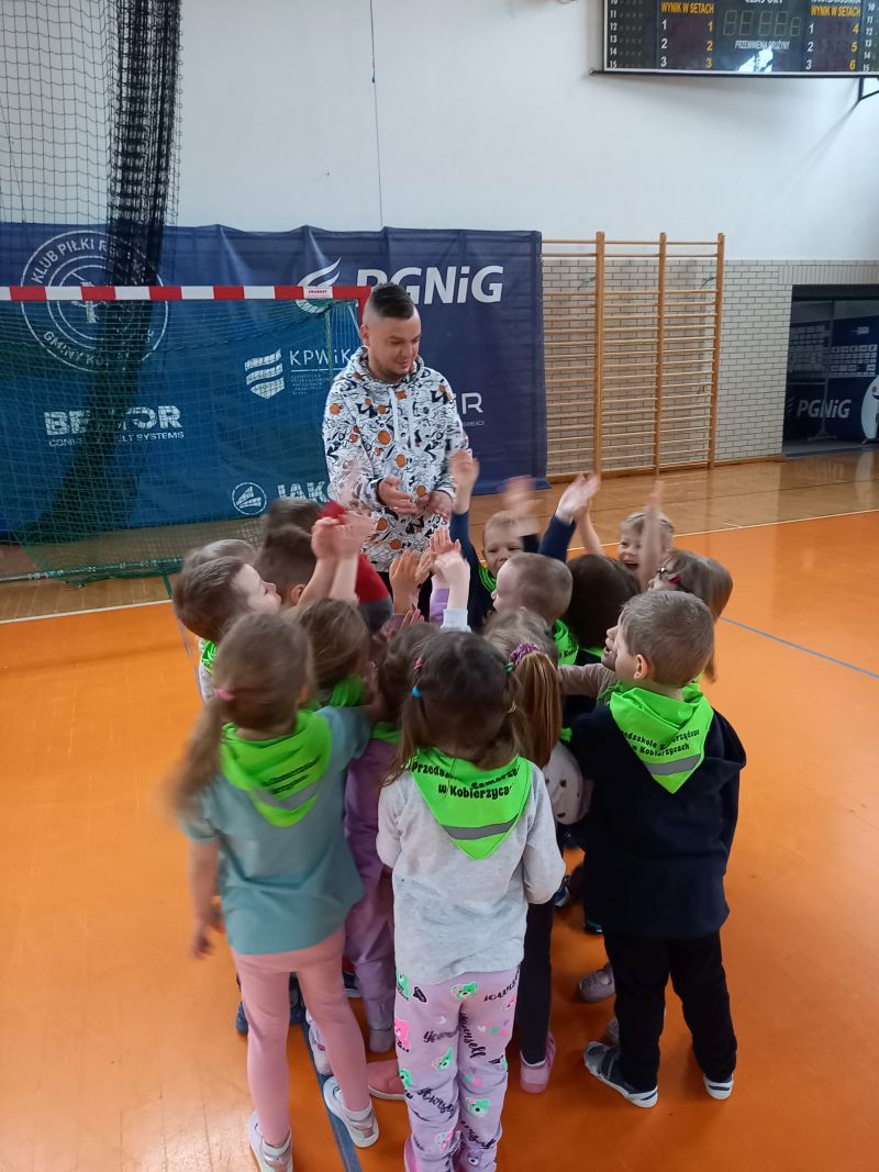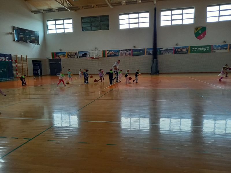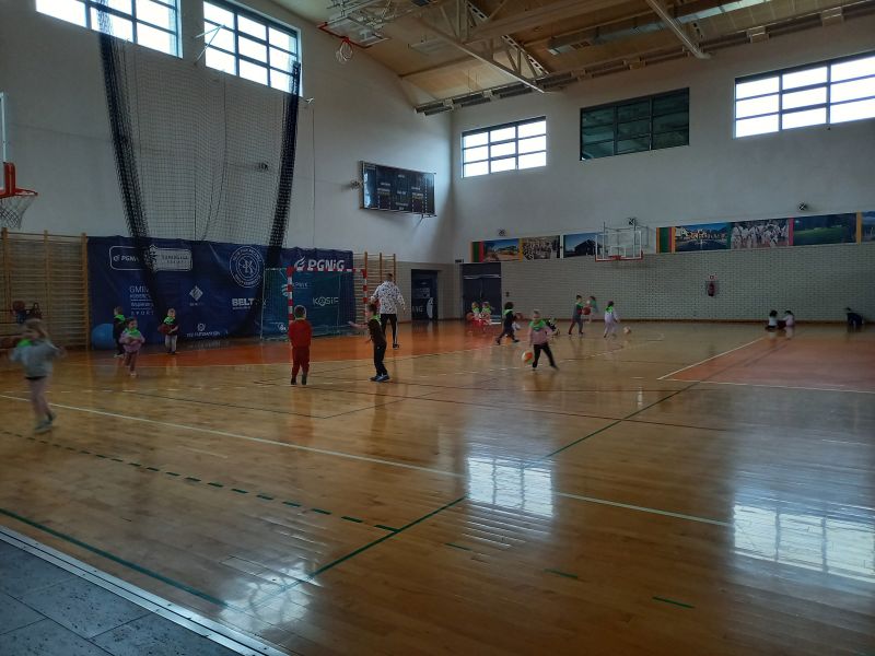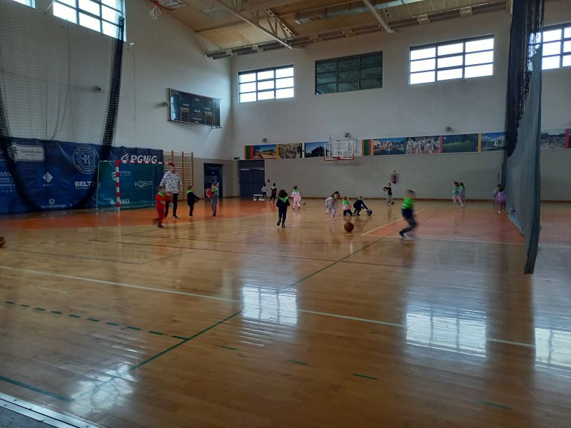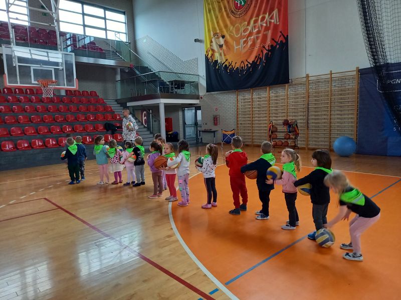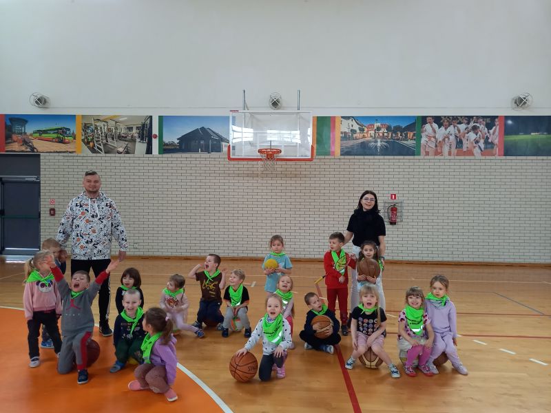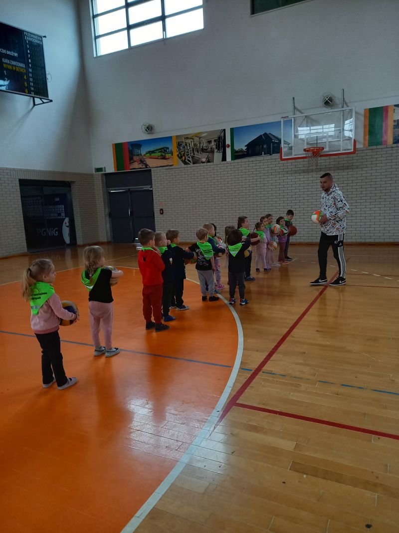 Zajęcia z trenerem koszykówkiPoniedziałek 20.03 był dla gr IV bardzo aktywnym dniem . A to za sprawą zorganizowanych przez trenera koszykówki Pana Karola Jaśko zajęć dla „Kotków” . Dzieci uczestniczyły w wielu zabawach z piłką koszykową. W ramach odpoczynku zwiedzaliśmy cały obiekt hali, zaglądaliśmy do szatni oraz na siłownię. Wszystkie dzieci były bardzo zaangażowane , co niezmiernie ucieszyło Pana trenera. Na zakończenie grupa otrzymała prezent w formie piłki koszykowej do zabaw w przedszkolu. Dzieci zmęczone , ale bardzo zadowolone wróciły do przedszkola .